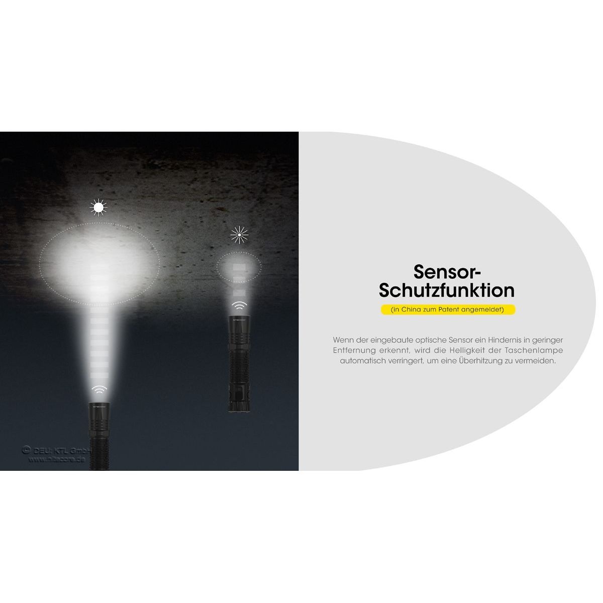 Lumin Shield TM und SEARCH sind als Momentlicht ausgelegt und können nicht dauerhaft eingeschaltet werden. Ein optischer Sensor erkennt Hindernisse vor der Linse und reduziert die Leuchtststärke, um Schäden zu vermeiden.